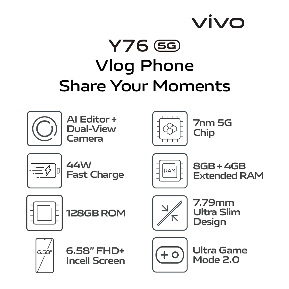 - Y76 5G is equipped with a vivo standard charger (power adapter 11V/4A), and supports up to 44W FlashCharge. The actual charging power is dynamically adjusted as the scene changes, and subject to actual use.